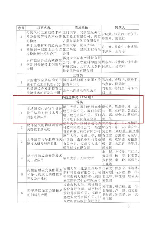 2018年10月31日,福建省人民政府發(fā)文公布2017年度福建省科學(xué)技術(shù)獎(jiǎng)勵(lì)和專(zhuān)利獎(jiǎng)勵(lì)的決定。其中乾照光電與廈門(mén)大學(xué)、廈門(mén)華聯(lián)電子股份有限公司、廈門(mén)光莆電子股份有限公司聯(lián)合申報(bào)的“多場(chǎng)調(diào)控化合物半導(dǎo)體量子結(jié)構(gòu)關(guān)鍵技術(shù)及其固態(tài)光源應(yīng)用”從454項(xiàng)科技進(jìn)步獎(jiǎng)項(xiàng)目中脫穎而出,榮獲福建省科技進(jìn)步獎(jiǎng)一等獎(jiǎng)。