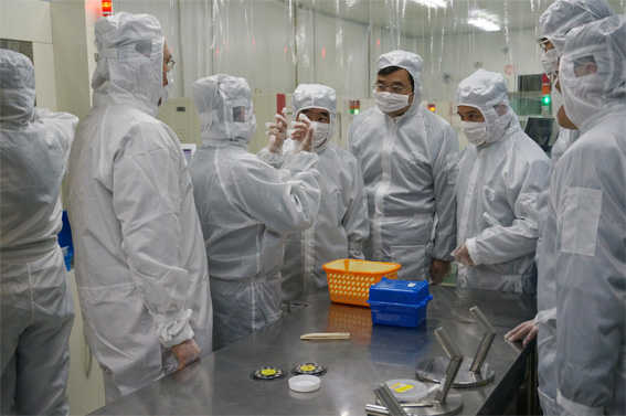 此次調(diào)研,我們陪同市委組織部的領(lǐng)導(dǎo)們參觀了芯片車間的工藝流程,并做了簡(jiǎn)單的工藝介紹。為了能夠近距離的了解到我們的產(chǎn)品,在開發(fā)區(qū)管委會(huì)主任季允豐的陪下,同市委組織部部長(zhǎng)張愛軍等一行6人便穿著無塵服前去外研車間近距離的觀察、了解我們的產(chǎn)品及性能介紹,并對(duì)我揚(yáng)州乾照光電有限公司引進(jìn)的高層次人才給予了高度的認(rèn)可。