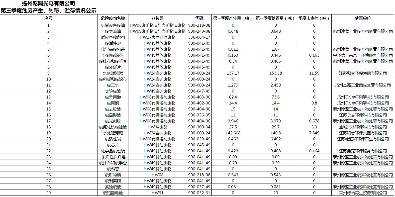揚(yáng)州乾照光電有限公司2023年第三季度危廢產(chǎn)生、轉(zhuǎn)移、貯存情況公示