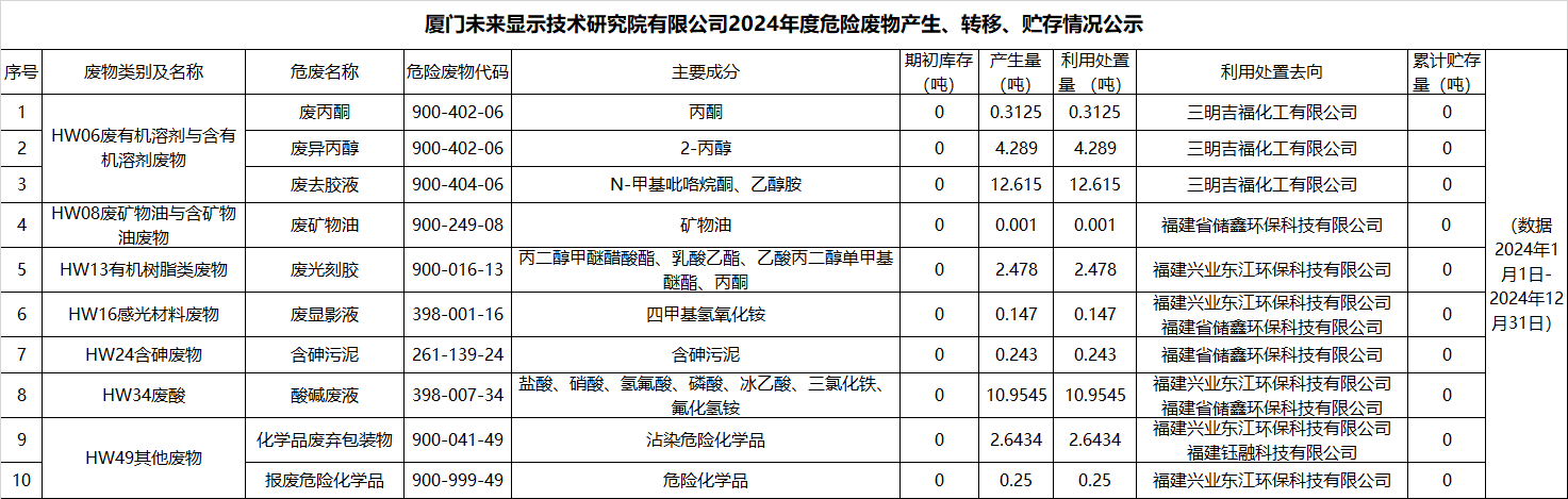 廈門未來顯示技術研究院有限公司2024年度危險廢物產生、轉移、貯存情況公示