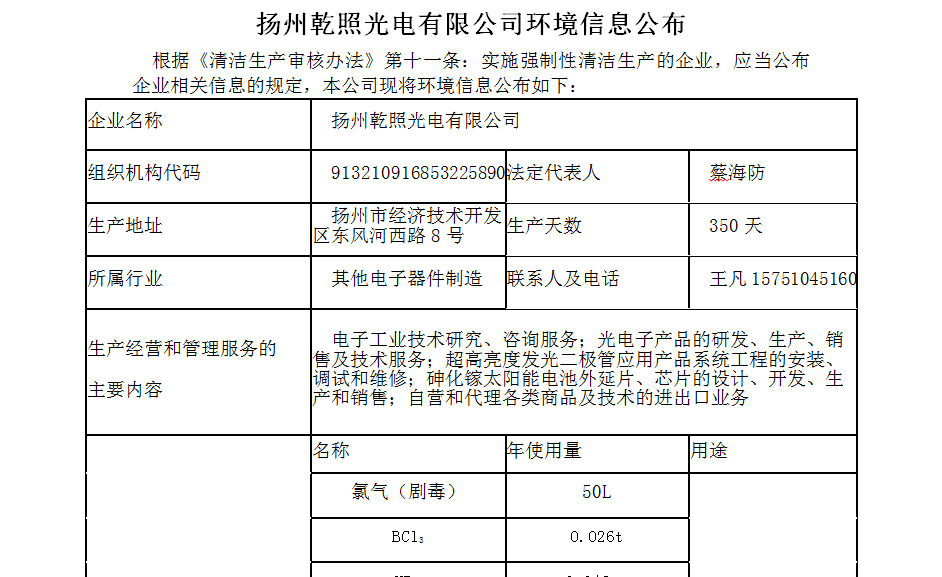 根據《清潔生產審核辦法》第十一條:實施強制性清潔生產的企業,應當公布企業相關信息的規定,本公司現將環境信息公布如下: 企業名稱 揚州乾照光電有限公司 ...