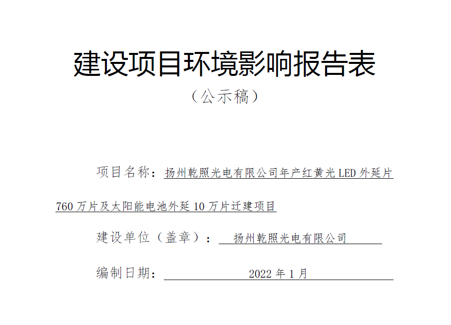 《揚州乾照光電有限公司年產紅黃光LED外延片760萬片及太陽能電池外延10萬片遷建項目環境影響報告表公示稿》 /uploadfiles/2022/04/20220402144205425.pdf 《揚州乾照光電有限公司年產紅黃光LED外延片760萬片及太陽能電...