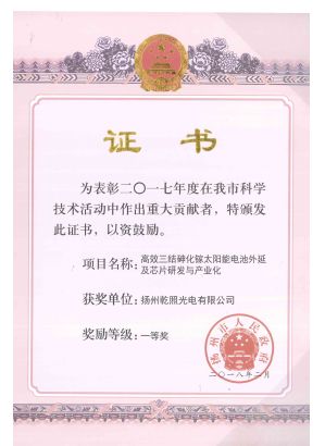 熱烈慶賀乾照光電榮獲揚州市科技進步獎一等獎