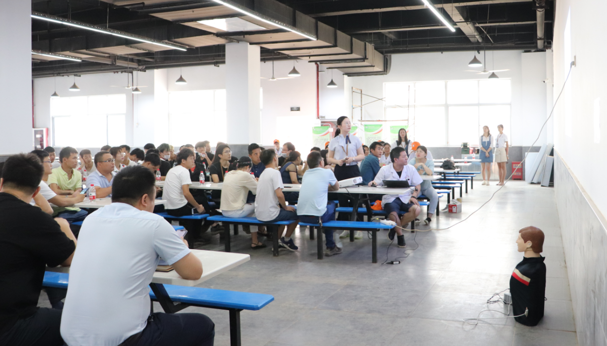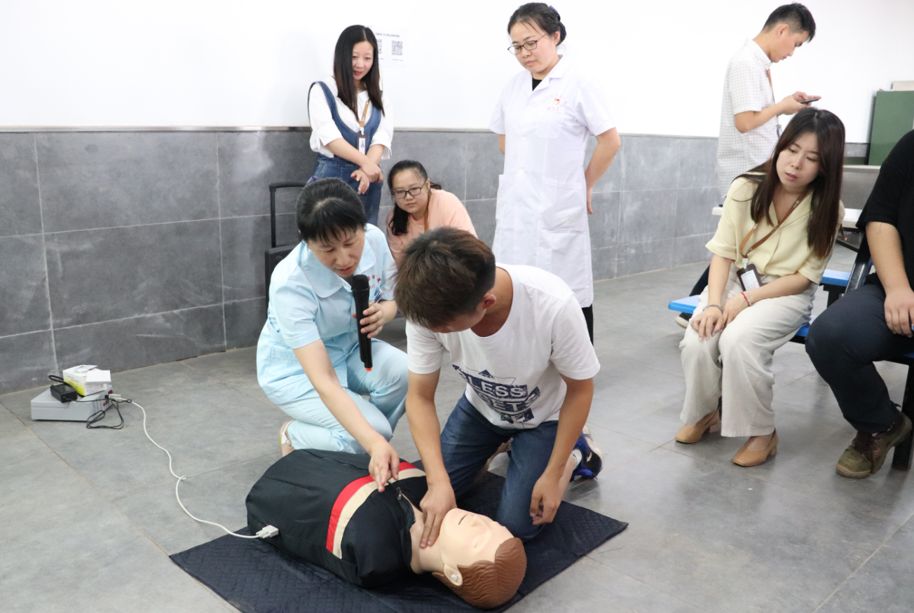 講座以理論和實(shí)踐相結(jié)合的方式展開,首先由江西省榮譽(yù)軍人康復(fù)醫(yī)院黎勇強(qiáng)、鐘笑兩位醫(yī)生分別對(duì)化學(xué)品灼傷,吸入有毒氣體的現(xiàn)場(chǎng)緊急處理、心肺復(fù)蘇的流程、外出血的現(xiàn)場(chǎng)處理、噎食的急救進(jìn)行了知識(shí)宣講。接著,高彩虹、付萍兩位醫(yī)生進(jìn)行了調(diào)整體位、打開氣道、判斷呼吸、人工呼吸、胸外心臟按壓等急救法的現(xiàn)場(chǎng)操作演示,并請(qǐng)員工們參與體驗(yàn),現(xiàn)場(chǎng)進(jìn)行急救操作,讓大家在輕松的教學(xué)氛圍中掌握心肺復(fù)蘇法的操作技能。