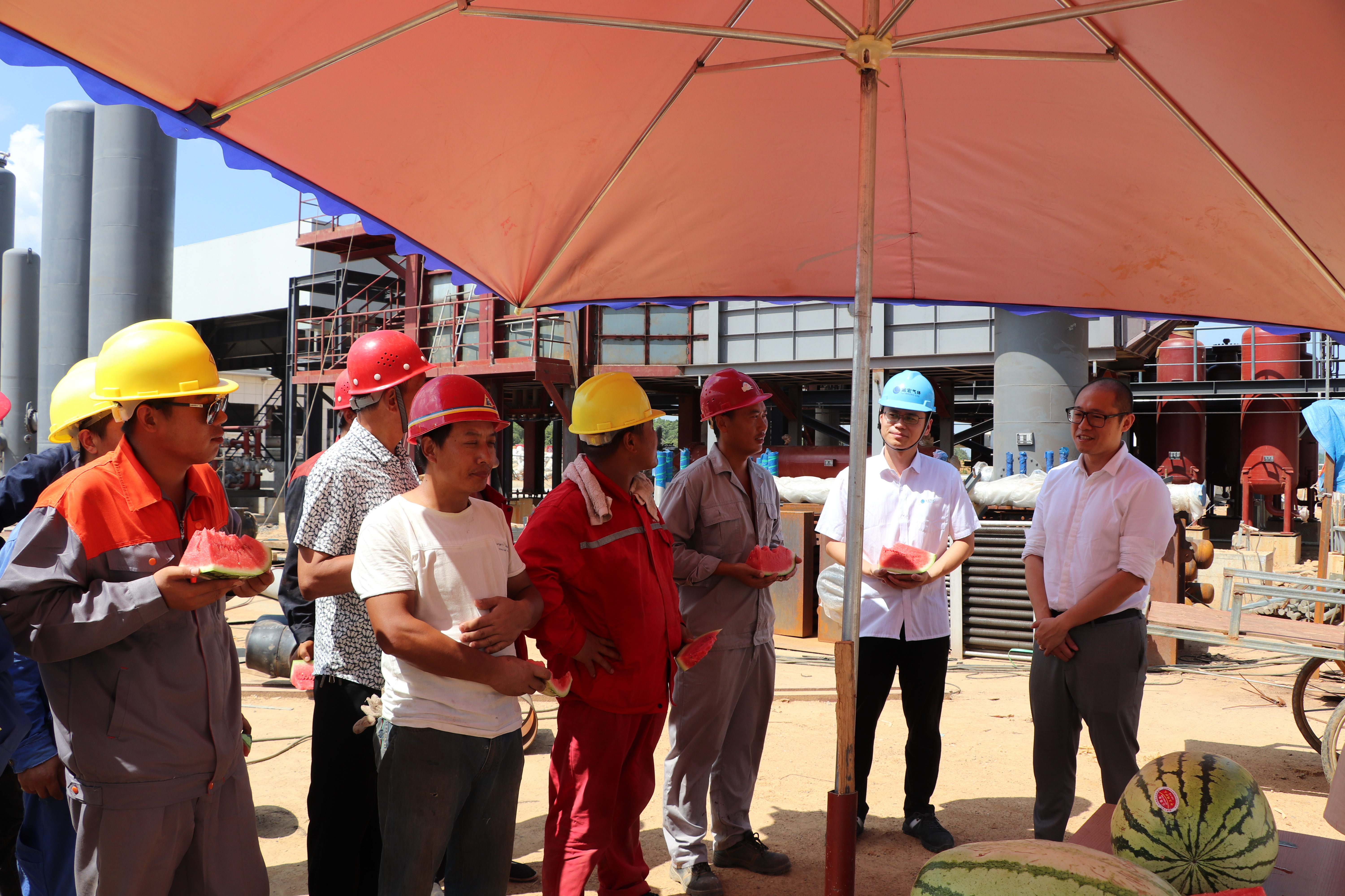 陳文戎先后走訪了制氫站施工現(xiàn)場、機電總包工程朗奧項目部、乾照光電廠務(wù)值班室,并親手把西瓜送到工人手中,工人們露出了開心的笑容。