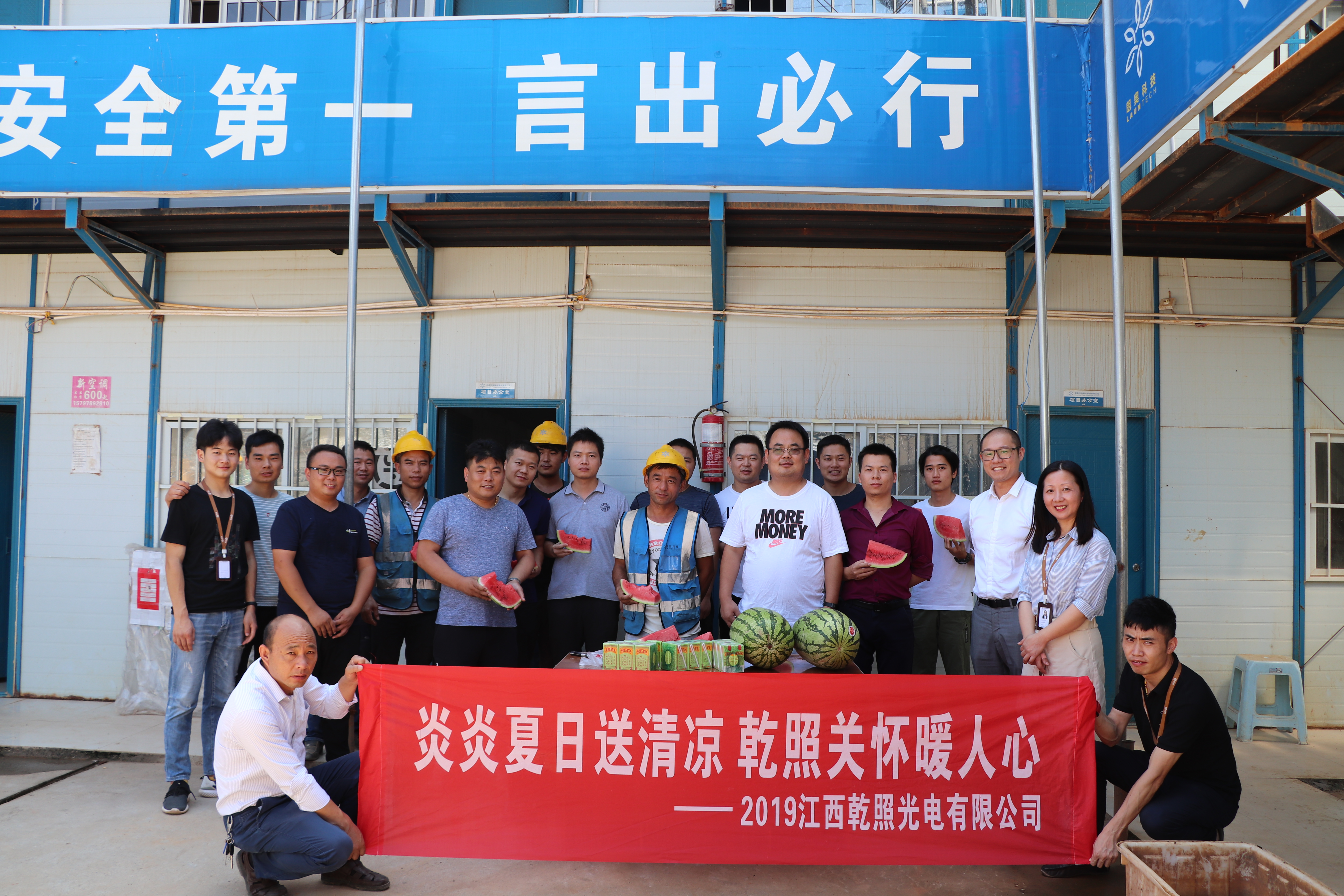 8月9日上午,江西乾照光電有限公司組織開展了“送清涼活動”,副總經(jīng)理陳文戎帶領(lǐng)總經(jīng)辦相關(guān)人員來到施工現(xiàn)場,為在一線辛勤工作的工人們送去了西瓜、礦泉水、涼茶和清涼油等消暑物品,并代表公司向大家表示慰問和感謝。
